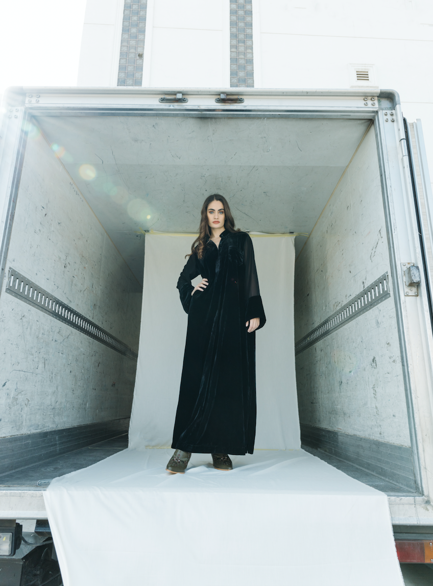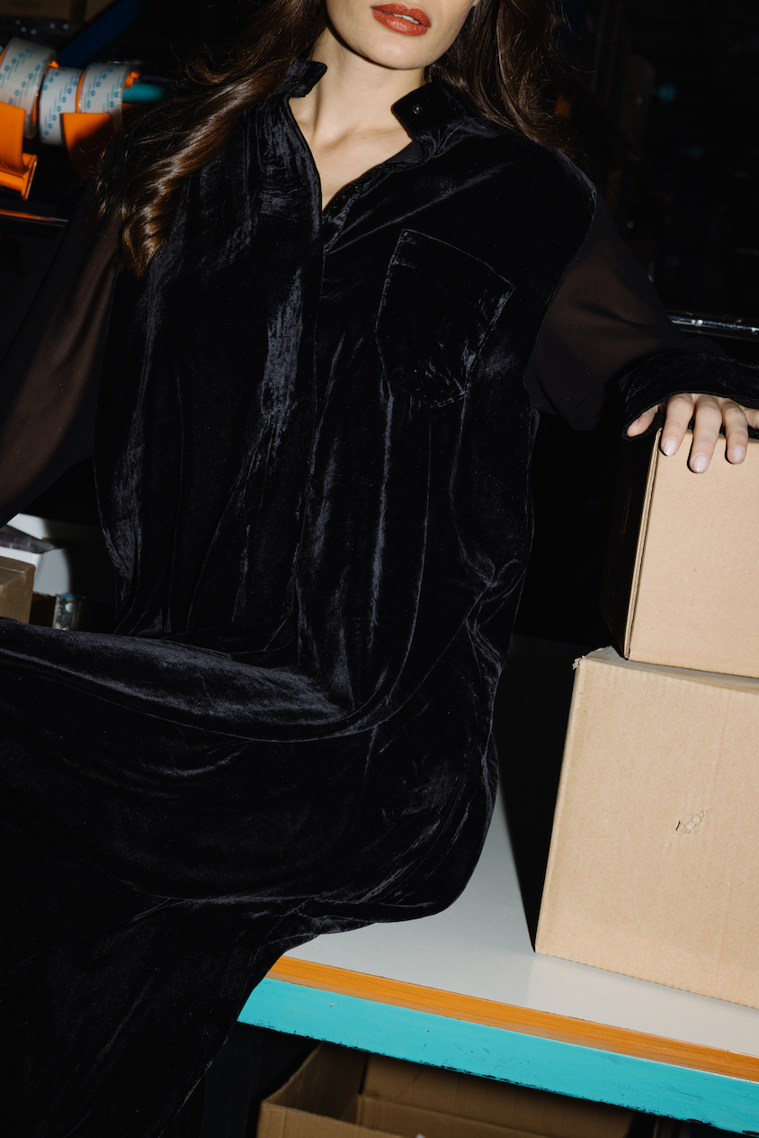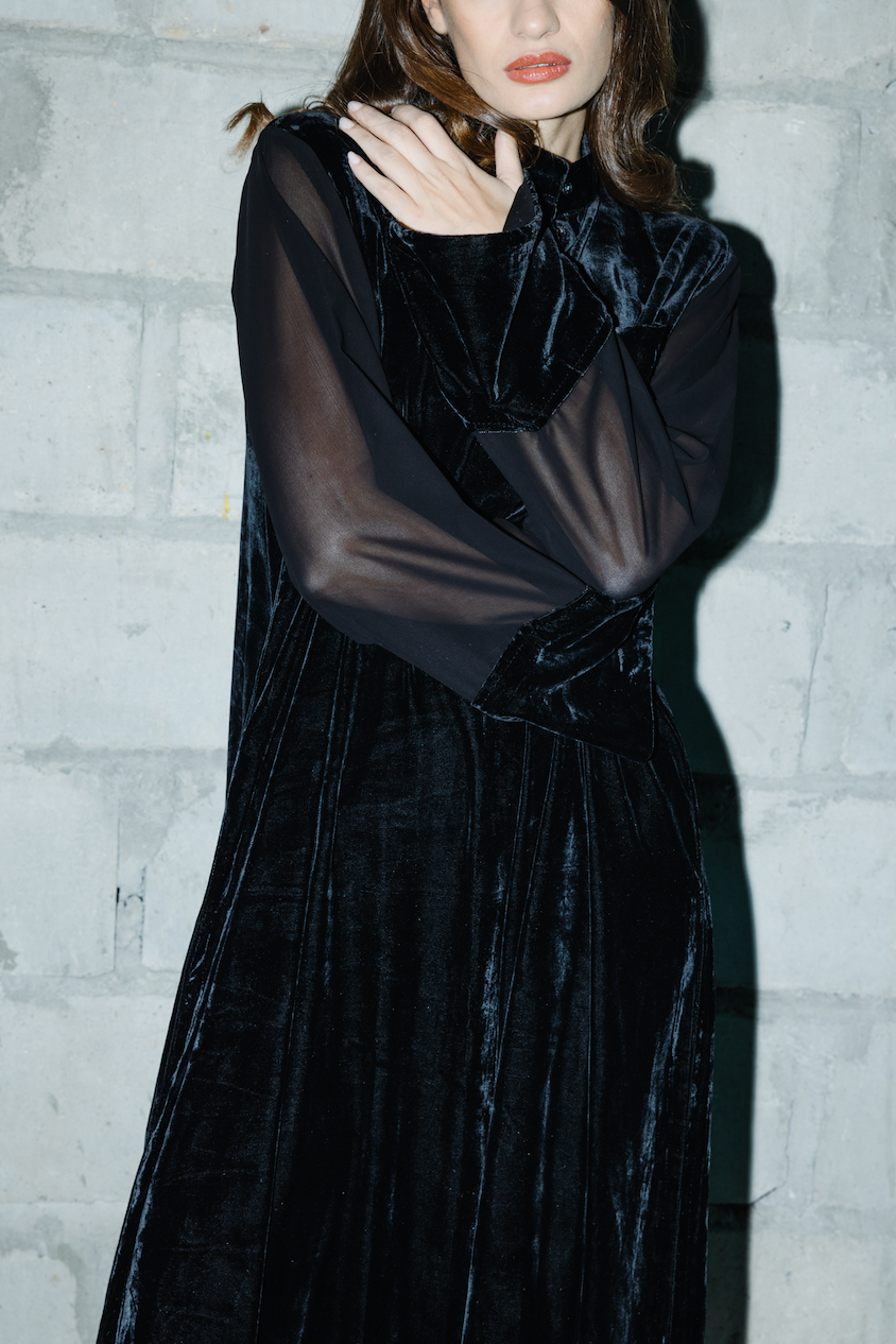 - black velvet dress, slight openings on the side
